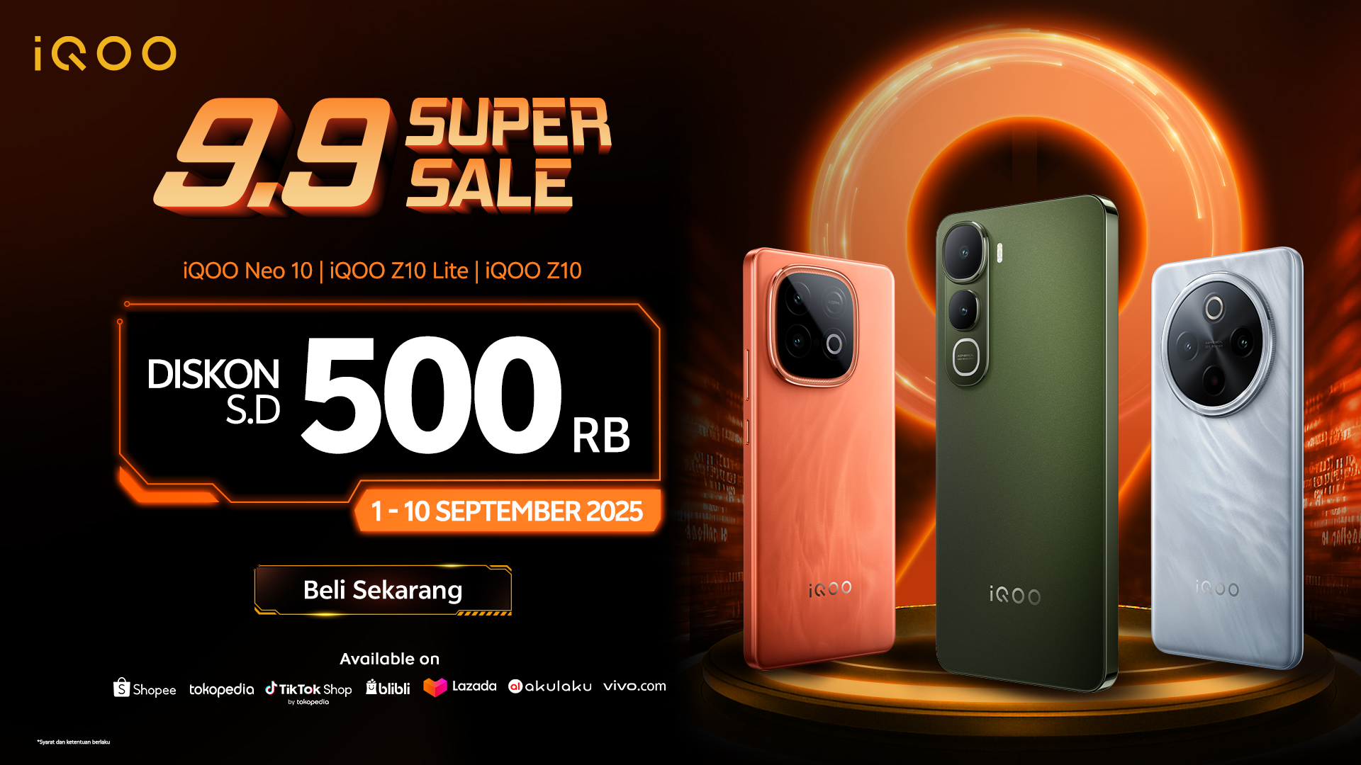 Promo iQOO 9.9 Super Sale dapat didapatkan melalui e-commerce online di Indonesia mulai dari Shopee, Tokopedia, TikTok, Blibli, Lazada, Akulaku, dan website resmi iQOO.com.