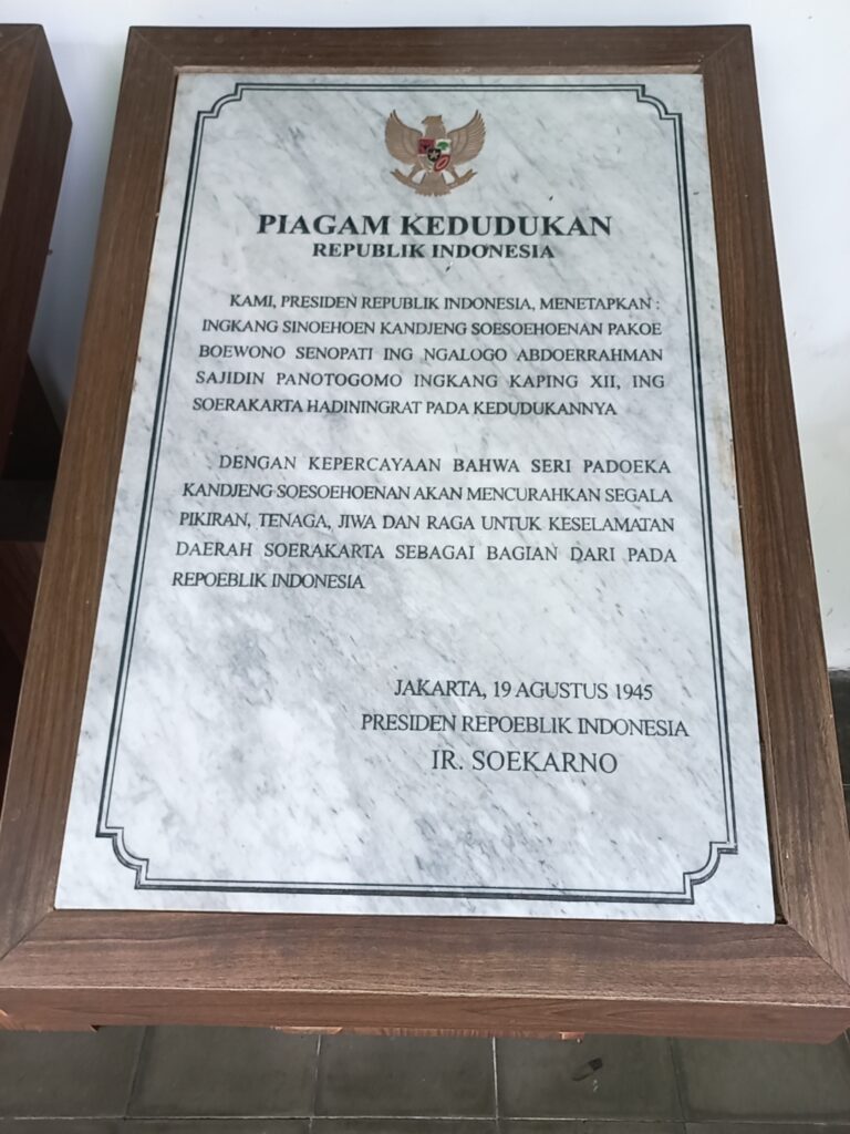 - Banyak yang belum tahu bahwa kasunanan Surakarta sempat menjadi daerah Istimewa. Ceritanya saat Kemerdekaan bangsa Indonesia diproklamasikan di tahun 1945, sama seperti kesultanan Yogya dan kadipaten pakualaman maka Kasunanan Surakarta bersama kadipaten Pakualaman juga menyatakan bergabung ke dalam bagian Republik Indonesia. Dan di museum ini kita bisa melihat maklumat yang ditandatangani dan diumumkan oleh Sunan PB ke XII di tanggal 1 September 1945 yang menyatakan bergabung ke Negara Republik Indonesia. Piagam Kedudukan Surakarta sebagai daerah Istimewa yang ditandatangani ole presiden pertama RI bapak Ir. Sukarno di tanggal 19 Agustus 1945 juga bisa kita lihat.